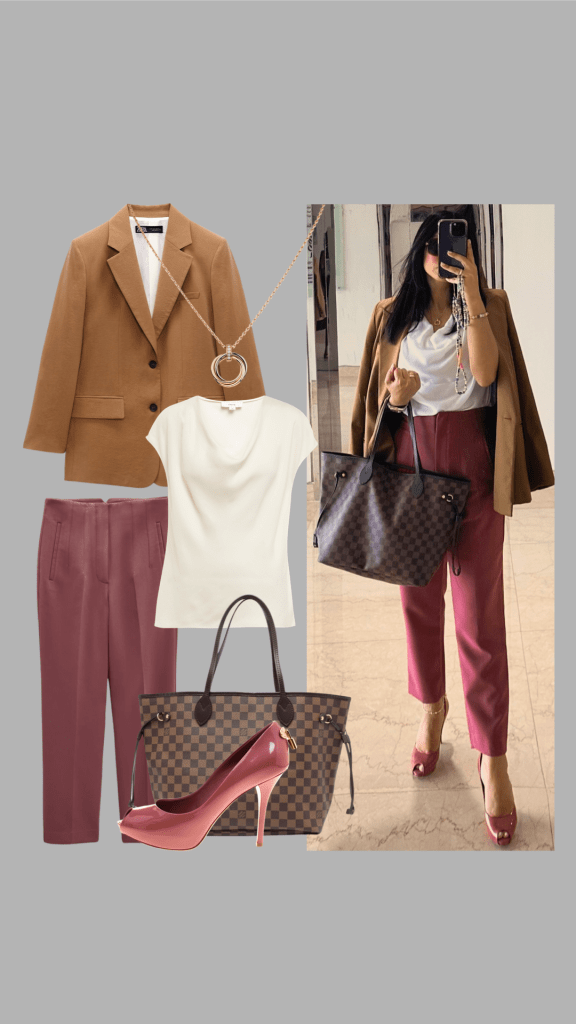 Sporting a wide-neck white shirt that adds a touch of elegance, paired with the amazing pale pink trousers from Zara that accentuate the body figure in all the right places – seriously, these pants are a game-changer! And to keep up with the warm tones, I’ve added a chic camel color blazer that completes the ensemble perfectly. 🧥